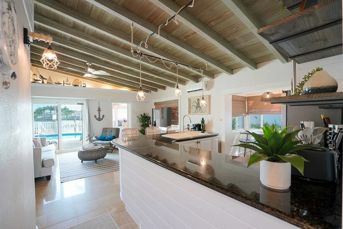 Treasure Cove is a great family-friendly coastal retreat that offers 3 bedrooms, 2 baths, heated pool, boat dock, street-legal golf cart, kayaks, and paddle board. The house is newly remodeled and decorated and equipped with everything guests need for a perfect beach vacation. The house is on the Intracoastal Waterway and is a quick walk, or golf cart ride, away from the white sand IRB beach.